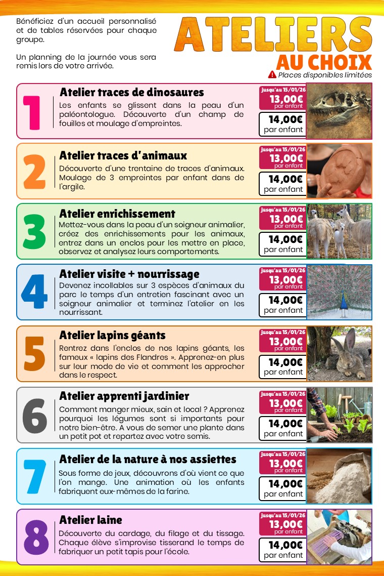 Une équipe de passionnés vous propose 8 ateliers pédagogiques adaptés aux classes maternelles et primaires. Un excellent support pédagogique à ramener à l’école autour de la nature, des animaux, des dinosaures et des fermes du monde entier.